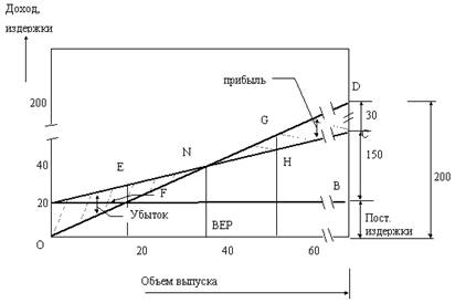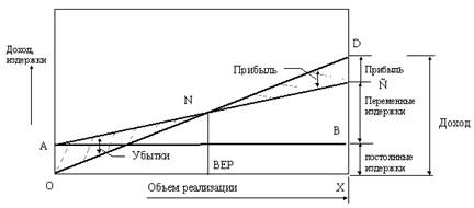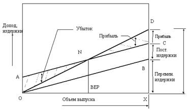 Для каждой конкретной цены продажи единицы конечного продукта линия ОD будет показывать величину доходов при различных объемах продаж. Пересечение линии совокупного дохода с линией совокупных издержек определяет точку безубыточности (BEP) "N", точку, в которой совокупный доход равен совокупным издержкам (переменным и постоянным). Любая разность по вертикали между линией совокупного дохода и совокупных издержек справа от BEP показывает прибыль при данном объеме производства, в то время как убытки будут показываться на графике слева от BEP, потому как в этом случае совокупные издержки превышают совокупный доход.