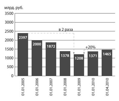 На протяжении последних лет задолженность перед бюджетом стабильно снижалась. Однако из-за последствий мирового экономического кризиса, оказавшего негативное влияние на финансовое состояние организаций всех отраслей экономики, в 2009 и 2010 годах она начала расти. На 1 апреля текущего года она составила почти 1,5 трлн. руб. И по сравнению с 1 января 2009 года увеличилась на 20% (рис. 2). При этом почти в два раза снизилась эффективность взыскания задолженности.