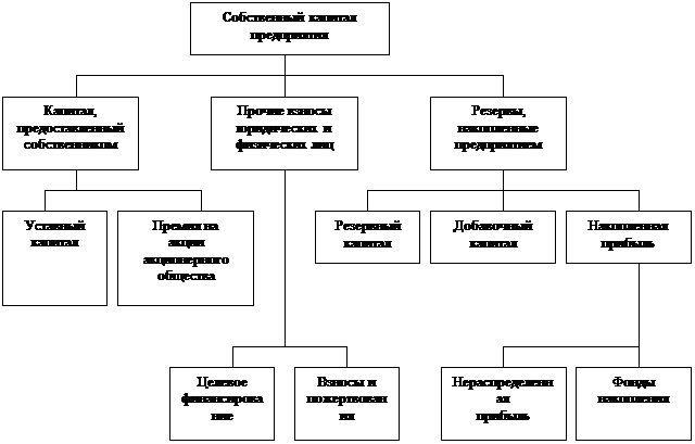 Эту часть финансовых ресурсов принято называть уставным фондом или уставным капиталом фирмы. В зависимости от организационно-правовой формы фирмы ее уставной капитал формируется за счет выпуска и последующей продажи акций (обыкновенных, привилегированных или их комбинации), вложений в уставной капитал паев, до и т.д. За время жизни фирмы ее уставной капитал может дробиться, уменьшаться и увеличиваться, в том числе за счет части внутренних финансовых ресурсов фирмы. Структура собственного капитала предприятия представлена на рисунке 1.