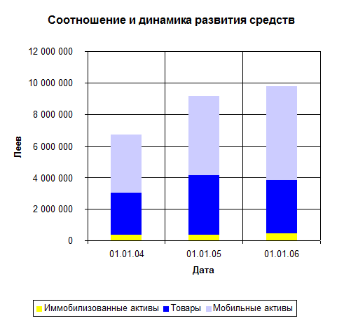 Оценка состава и структуры источников финансовых ресурсов, проведенная в работе выявила тенденцию увеличения доли привлеченных финансовых ресурсов при несущественном увеличении собственных источников. Финансовые ресурсы трансформируются в активы предприятия. Динамика активов свидетельствует об увеличении доли мобильных активов в составе имущества предприятия при соответствующем снижении доли внеоборотных активов. Увеличение доли мобильных активов произошло за счет роста дебиторской задолженности и денежных средств, на фоне уменьшения товара, что говорит об успешной коммерческой деятельности предприятия, т.е. надежный способ повышения мобильности имущества.