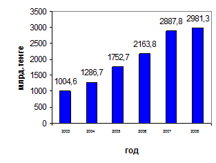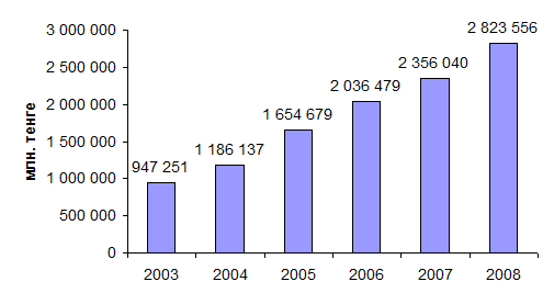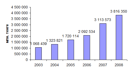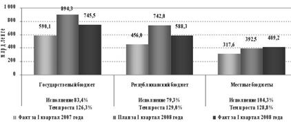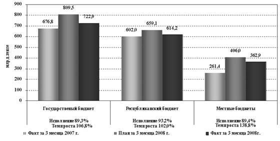 Общие показатели государственного бюджета Республики Казахстан выглядят следующим образом: за 2008 год поступления в государственный бюджет без учета поступлений займов составили 4 040,5 млрд.тенге и исполнены на 99,5%, расходы государственного бюджета за 2008 год без учета погашения займов составили 4 373,8 млрд.тенге, или 99,0% к плану в сумме 4 419,6 млрд.тенге. При запланированном дефиците в сумме 359,5 млрд.тенге, фактически дефицит сложился в сумме 332,2 млрд. тенге.
