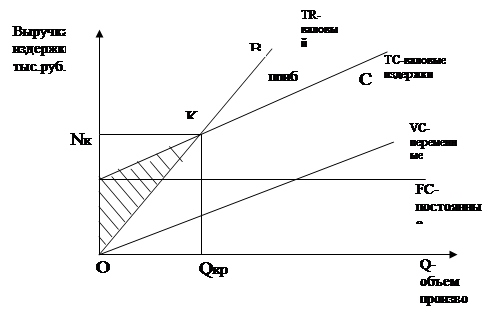 Точка пересечения линий выручки и валовых затрат представляет собой точку безубыточности (К). Эта точка интересна тем, что при соответствующем ей объеме производства и продаж (Qкр) у предприятия нет ни прибыли, ни убытков. Объем производства, соответствующий точке безубыточности носит название критического. При объеме производства меньше критического предприятие своей выручкой не может покрыть затраты и, следовательно, результатом его деятельности являются убытки. Если объем производства и продаж превышает критический, предприятие получает прибыль.