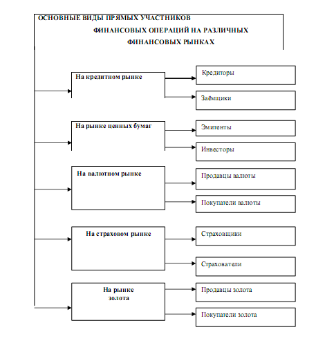 Рис 3.2. Основные виды прямых участников финансовых операций на различных финансовых рынках [16; с. 333]
