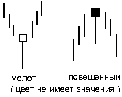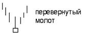 Перевернутый молот, схож с падающей звездой. Но необходимо дождаться подтверждающих бычьих сигналов. Например, следующая цена открытия выше тела перевернутого молота, другое подтверждение – белая свеча с более высоким уровнем цены.