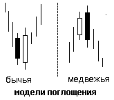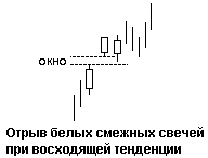 Если при восходящей тенденции появляется белая свеча, образующая отрыв вверх, а за ней следует еще одна белая свеча примерно такого же размера и почти с такой же ценой открытия, то перед нами бычья модель продолжения тенденции.