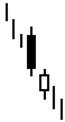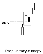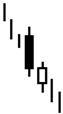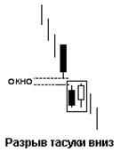 «Отрыв свечей вниз» так же является моделью продолжения тенденции. В случае ее появления падение цен продолжится. Встречается крайне редко, так как чаще ценовой разрыв вниз образуют черные свечи, и если после черной свечи, образовавшей окно появится еще одна черная свеча, с более низкой ценой закрытия, - то это означает, что тенденция к снижению цен сохранится.