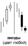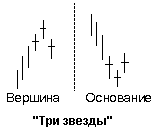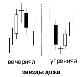 Например, модель «три звезды» образуется тремя дожи. Появляется очень редко, но является важнейшей моделью разворота. Идеальной модели «три звезды» практически никогда не бывает, но за нее можно принимать и модели, в которых средняя звезда - дожи, а две другие либо дожи, либо близкие к ней свечи.