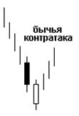 Бычья контратака похожа на модель «в основании», но белая бычья контратакующая свеча открывается значительно ниже (она значительно длиннее), поэтому «контратака» - модель разворота, а «в основании» – модель продолжения тенденции. Главное условие заключается в том, что цена открытия второй торговой сессии значительно ниже (бычья контратака) или выше (медвежья контратака) предыдущей свечи.