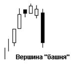 Вершина «башня» является моделью разворота на вершине. Вначале появляется длинная белая свеча (или серия белых свечей), затем повышение рынка замедляется и начинается снижение. Вершина «башня» считается сформированной после появления одной или нескольких длинных черных свечей.