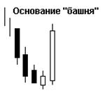 Основание «башня» формируется в области низких цен при нисходящей тенденции. После появления одной или нескольких длинных черных свечей наступает короткая пауза. Затем появляется одна или несколько длинных белых свечей. Формируется основание, обрамленное с двух сторон башнями, то есть длинными черными свечами, отражающими падение цен, и длинными белыми свечами, показывающими рост цен.