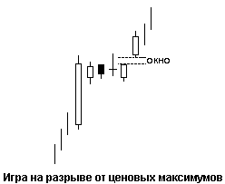 После резкого повышения цены в течение одной, двух торговых сессий рынок на время приостанавливается. На рынке начинается консолидация, в результате которой образуется группа свечей с маленькими телами, что свидетельствует о том, что рынок находится в нерешительности. Затем цена открытия образует ценовой разрыв вверх. Эта модель называется «игра на разрыве от ценовых максимумов». Ее название связано с тем, что цены колеблются вблизи недавнего максимума, а затем образуют ценовой разрыв вверх.