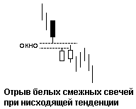 Модель встречается очень редко, еще реже встречается модель «отрыв белых смежных свечей вниз».