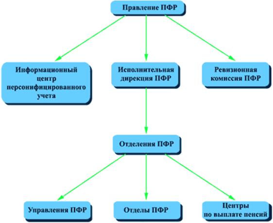 Руководство Пенсионного фонда России осуществляет Правление и его постоянно действующий орган - Исполнительная дирекция. Дирекции подчиняются отделения в республиках в составе РФ, отделения в национально - государственных и административно-территориальных образованиях. На местах (в городах, районах) имеются уполномоченные Фонда. Отделения обеспечивают организационную работу по сбору взносов на социальное страхование, финансирование органов социального обеспечения, региональных программ социального обеспечения, а также контроль за расходованием средств.