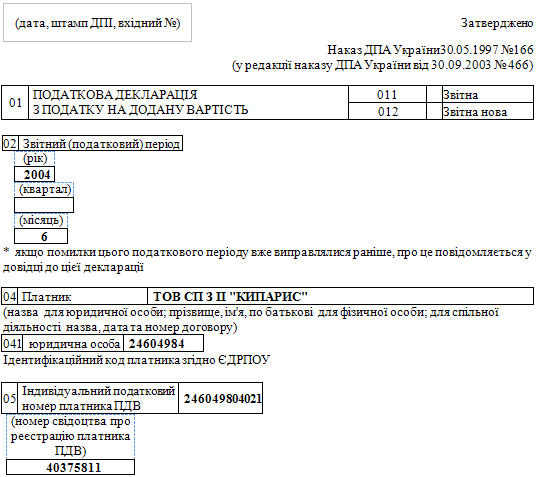 Додаток А. Декларація розрахунку податку на додану вартість СП "КИПАРИС"