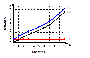 Сумма постоянных и переменных издержек при каждом данном объёме производства образует общие издержки TC. Из графика видно, что для получения кривой общих издержек сумму постоянных издержек TFC необходимо прибавить к сумме переменных издержек TVC (рис. 1).