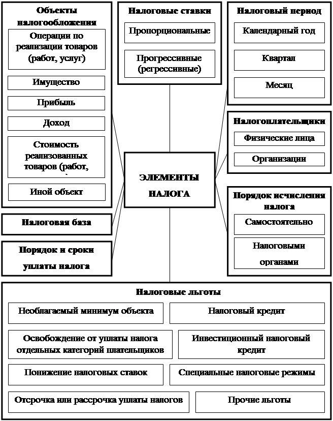 Налоговый кодекс или закон о каждом конкретном налоге содержит следующие основные элементы (рис. 1) :