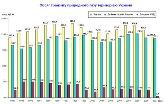 Рис.1.4. Обсяг транзиту природного газу територією України у 1991 -2007 роках [108]