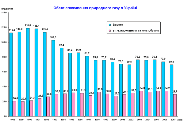 Річне споживання газу в Україні в середньому становить 78 млрд. кубометрів. Необхідна його кількість забезпечувалась до 2005 року передусім за рахунок отримання щорічно до 28 млрд. кубометрів газу як плати за транзит російського газу через українську територію до країн Європи і Туреччини.