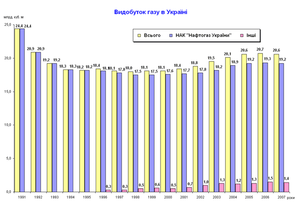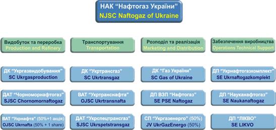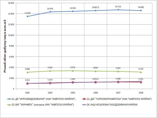 Видобуток газу, газового конденсату та нафти в Україні здійснюють дочірні та підконтрольні компанiї газового державного монополіста НАК «Нафтогаз України» - ДК «Укргазвидобування», ВАТ «Укрнафта» та ДАТ «Чорноморнафтогаз», на якi припадає 95% видобутку нафти i конденсату та 94% видобутку газу в Українi, та декілька десятків незалежних підприємств, добича газу в яких, згідно законодавству [108], також підлягає контролю з боку НАК «Нафтогаз України».