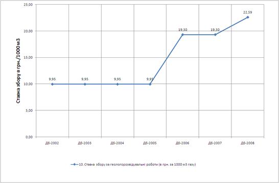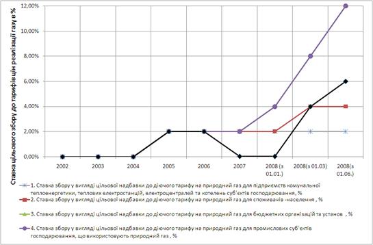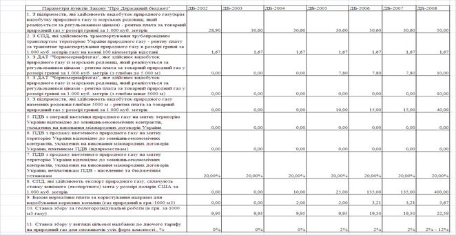 Динаміка ставок спеціальних зборів в державний бюджет України з операцій добування, транспортування та продажу природного газу в Україні у 2002 -2008 роках