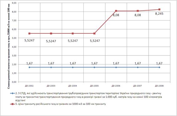 Треба зазначити, що у 2005 році у зв'язку із світовим зростанням цін на нафту, нафтопродукти і природний газ збільшилася й ціна закупівлі турменського газу з 44 доларів (у 2004 році) до 58 доларів США за тисячу кубометрів у 2005 році. До того ж розрахунок за закуплений газ у 2005 році мав проводитися на 50% валютою і 50% - поставкою матеріальних ресурсів. Крім того, у 2005-2009 роках по 13,9 млрд. м3 туркменського природного газу треба віддавати в рахунок оплати за транзит фірмі "RosUkrEnergo", яка за договором організовує та сплачує транспортування газу від Туркменістану до східного кордону України. Таким чином, ціна газу на україно-російському кордоні з урахуванням транспортних витрат у 2005 році складала 78 доларів за тисячу м3 (тобто на 20 доларів дорожче ціни в Туркменістані).