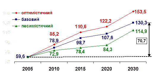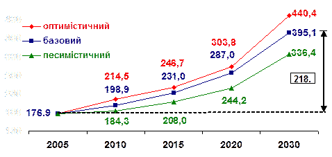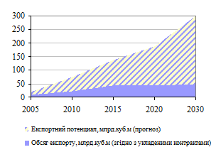 Україна має розвинену газотранспортну систему, яка включає 38,0 тис. км газопроводiв, в тому числi 14 тис. км дiаметром 1020-1420 мм, 73 компресорнi станцiї (110 компресорних цехiв) загальною потужнiстю 5400 МВт, 13 пiдземних сховищ газу. Пропускна спроможнiсть системи становить на входi 290 млрд.куб.м на рiк, а на виходi – 178,5 млрд.куб.м на рiк (Рис.1.2).