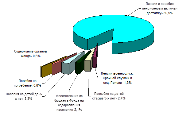 Расходная часть Фонда показана на рис. 2. Наибольшая часть расходов - это расходы на выплату пенсий, доля которых в общей сумме расходов составила около 89%.