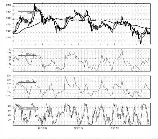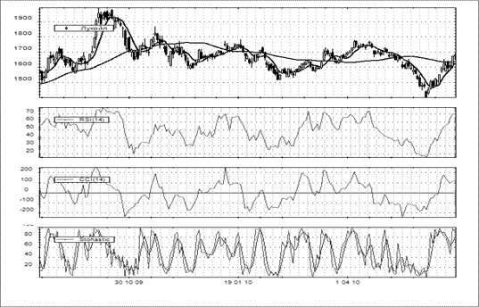 Рис. 2.17 - График стоимости акций Лукойла и котировок Лукойла с осцилляторами технического анализа