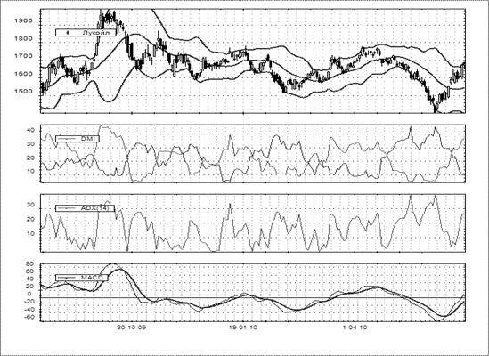Рис. 2.16 - График стоимости акций Лукойла и котировок Лукойла с индикаторами технического анализа