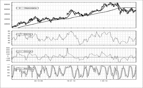Рис. 2.19 - График стоимости акций Норникеля и котировок Норникеля с осцилляторами технического анализа
