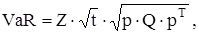 де Z - кількість середніх квадратических відхилень, яка відповідає заданому довірчому інтервалу; t - часовий обрій; p - вектор розміру позицій; Q - ковариационная матриця змін вартості позицій.