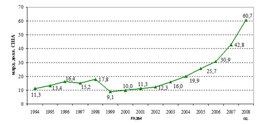 Рис 3.1 Экспорт товаров Российской Федерации в I кварталах 1994-2008 годов (по методологии платежного баланса)