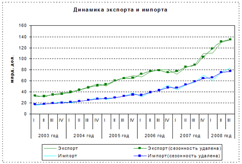 На основе статистики Банка России можно заключить, что в третьем квартале 2008 г. стоимость экспорта поднялась на 4,6% по сравнению с предыдущим кварталом (с исключенной сезонностью), что было поддержано ростом цен на нефть. При этом, в помесячном выражении (без сезонности), в сентябре наблюдалось снижение на 2,7%.