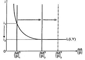 підвищує попит на гроші і, таким чином, спричиняє появу надлишковогопопиту на гроші в початковому положенні рівноваги. Надлишковий попит на гроші задовольняється економічними агентами за допомогою продажу облігацій або позичок у комерційних банків. Збільшення попиту на позики сприятиме зростанню процентної ставки. Аналогічно, і продаж облігацій триватиме доти, доки процентна ставка не зросте до рівня, що відповідає новій рівновазі.