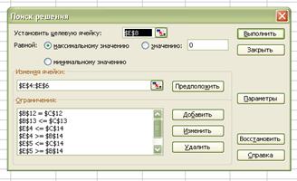 Расчет задачи осуществим в среде MSEXEL. Для решения используем надстройку редактора MSEXEL “Пакет анализа”, функцию «поиск решения».