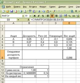 Таким образом, оптимальный портфель в нашем случае должен состоять на 69,4 % из акций А, на 12,5 % из акций В и на 18,1 % из акций С.