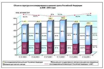 Консолидированный внешний долг Российской Федерации, по данным Банка России, за 2008 год увеличился на 12,5 млрд. долларов США, или на 2,3 %, и на 1 января 2009 года составил 483,5 млрд. долларов США, или 34,2 % ВВП, за I квартал 2009 года сократился на 32,7 млрд. долларов США, или на 6,8 %, и составил на 1 апреля 2009 года 450,8 млрд. долларов США, или 37,8 % ВВП, за II квартал 2009 года увеличился на 24,3 млрд. долларов США и составил на 1 июля 2009 года 475,1 млрд. долларов США, или 37,85 % ВВП