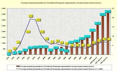 Динамика внутреннего госдолга, выраженного в государственных ценных бумагах, в сопоставлении с ВВП в 1993 - 2012 годах представлена на следующей диаграмме 2.