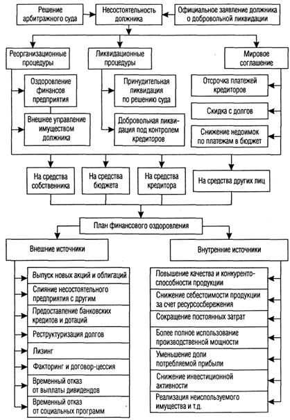 Система защитных финансовых механизмов при угрозе банкротства зависит от масштабов кризисной ситуации. При легком финансовом кризисе достаточно нормализовать текущую финансовую ситуацию, сбалансировать и синхронизировать приток и отток денежных средств. Глубокий финансовый кризис требует полного использования всех внутренних и внешних механизмов финансовой стабилизации. Полная финансовая катастрофа предполагает поиск эффективных форм санации, в противном случае — ликвидация предприятия.