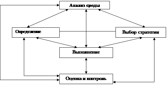 Стратегическое управление можно рассматривать как динамическую совокупность пяти взаимосвязанных управленческих процессов. Эти процессы логически вытекают (или следуют) один из другого. Однако существует устойчивая обратная связь и соответственно обратное влияние каждого процесса на остальные и на всю их совокупность. В этом заключена важная особенность структуры стратегического управления. Схематически структура стратегического управления изображена на рисунке 1.