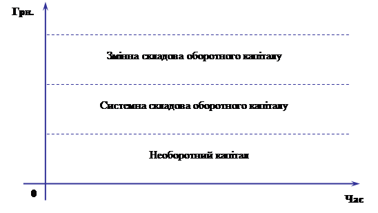 Оборотні активи підприємства на відміну від необоротних мають досить рухливу структуру. При змінах на ринку залежно від сезону, роботи постачальників тощо запаси сировини, готової продукції та залишки на розрахунковому рахунку можуть коливатись у значних межах. При цьому завжди можна визначити максимальний і мінімальний рівні оборотних активів. Різницю між максимальним та мінімальним рівнем оборотних активів називають сезонною (змінною) складовою, оскільки при стабільній ситуації в економіці значні коливання рівня оборотних активів переважно пов’язані із сезонним характером діяльності підприємства. Мінімальний рівень оборотних активів визначає постійну (системну) складову оборотного капіталу (рис. 1.2).