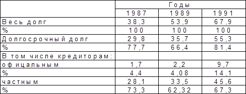Отношение внешнего долга к экспорту поднялось с 52% в 1987 г. до 164% в 1993 г., а к объему ВВП - с 8 до 29%. Увеличивались заимствования у правительств иностранных государств. Доля кредиторов - правительств других стран выросла с З,9%в 1987 г. до 14,3% в 1991 г. и 65,4% в 1993 г. Это было обусловлено сокращением коммерческого кредитования, переоформлением части обязательств, в том числе просроченной кредиторской задолженности перед бывшими соцстранами, в задолженность перед государством. В связи с этим несколько улучшилась структура долга.