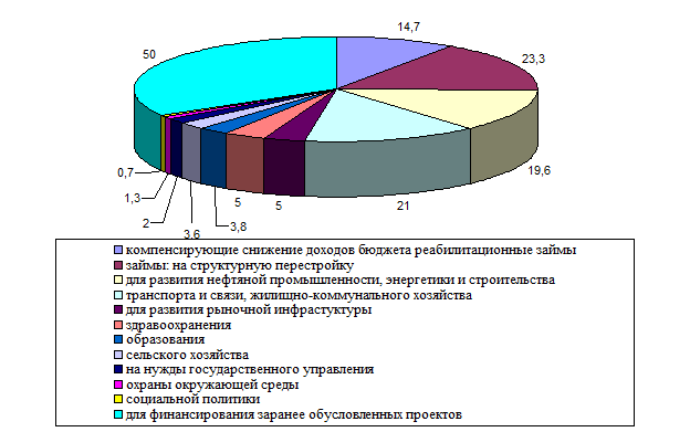 В общей сложности на 1 января 1999 г. России было предоставлено по этой линии 37 займов на общую сумму более 9 млрд. долл. Параллельно и последовательно получаемые кредиты МБРР и ЕБРР были представлены соглашениями, связанными с рыночной трансформацией экономики и социальной сферы - с оплатой дорогих консультационных услуг. Все они отражают так называемые рыночные институциональные преобразования. Это проекты развития контор, институциональных новообразований, заведений, мало значимых для социально-экономическог развития организационных структур. Производственная или социальная направленность их была слабой. К производственным относится, например, соглашение о займе между Российской Федерацией и Международным банком реконструкции и развития (первый нефтяной восстановительный заем) на 300 млн. долл. и соглашение (проект по закупке медицинского оборудования) на сумму 270 млн. дол.