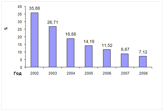 Размер государственного долга в абсолютном выражении не дает полного представления о состоянии экономики и платежеспособности страны. Для оценки способности страны-дебитора выполнять обязательства по погашению и обслуживанию накопленного объема государственного долга мировая практика выработала долговые показатели (коэффициенты). Одним из критериев оценки долговой устойчивости является анализ объема ресурсов, которыми располагает страна должник, т. е. размер и темпы роста ВВП в сопоставлении с государственным долгом. Этот показатель позволяет оценить уровень долговой нагрузки на экономику страны и отражает ее потенциальные возможности переориентировать национальное производство на экспорт в целях получения иностранной валюты и обеспечения способности погасить внешний долг. Чем выше данный показатель, тем большую долю доходов от реализации произведенного продукта государство вынуждено направлять не на внутреннее развитие, а на выполнение долговых обязательств перед внешними кредиторами. Если накопленный долг превышает объем средств, который в средне- и долгосрочной перспективе страна-дебитор может направить на выполнение долговых обязательств, возникает ситуация "долгового навеса". Условной границей начала такого опасного состояния внешнего долга принято считать превышение объемом долга 50% объема ВВП. Подобное положение было характерно для экономики Российской Федерации с начала 1990-х гг. и вплоть до 2001 г[10] . За последние годы объем государственного долга, его удельный вес в объеме ВВП имеет устойчивую тенденцию к снижению. Если в 2002 г. объем внешних заимствований составлял 35,88% в объеме ВВП, то в 2008 г. – 7,12 % .