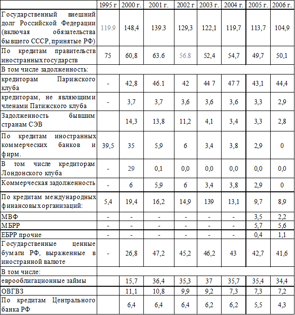По состоянию на 2006 год государственный внешний долг Российской Федерации (включая обязательства бывшего Союза ССР, принятые Российской Федерацией) складывается из: