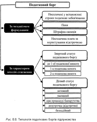 Податковий борг (недоїмка) - податкове зобов'язання (з урахуванням штрафних санкцій за їх наявності), самостійно узгоджене платником податків або узгоджене в адміністративному чи судовому порядку, але не сплачене у встановлений строк, а також пеня, нарахована на суму такого податкового зобов'язання.Податкові борги підприємства можуть бути охарактеризовані з використанням зазначених нижче класифікаційних ознак [83] (рис. 8.8).