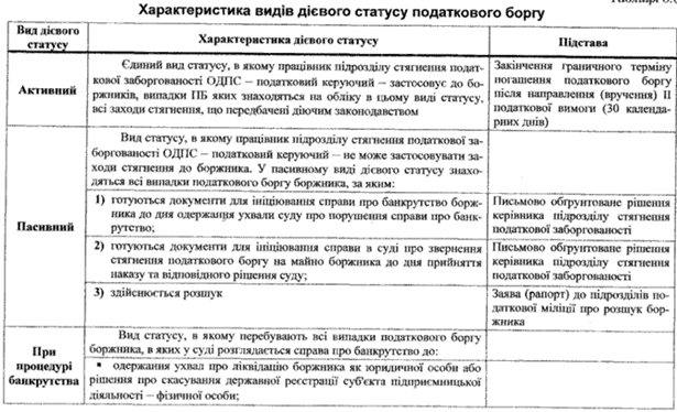 – дієвий статус – це статус, в якому в результаті певних дій фіскальних служб відбувається зменшення податкового боргу. У дієвому статусі розрізняють активний, пасивний та безнадійний типи податкового боргу. Активний тип передбачає збереження можливостей застосування до боржника всіх стягнень, передбачених законодавством. Пасивний тип означає неможливість застосування до боржника заходів стягнення через об’єктивні причини (підготовка документів для ініціювання справи про банкрутство платника (до прийняття ухвали суду про порушення справи про банкрутство); порушення провадження у справі про банкрутство прийняття рішення судом про призупинення стягнення; підготовка документів для ініціювання справи про звернення стягнення боргу на майно платника (до прийняття відповідної ухвали суду); розшук платника-боржника; відсутність активів). Безнадійним податковий борг вважається у таких випадках: платник визнаний банкрутом і його активів недостатньо для задоволення вимог; платник – фізична особа – у судовому порядку визнаний зниклим або померлим, а майна недостатньо для задоволення вимог; минули терміни позовної давності (за відсутності сум податкового боргу, стосовно яких граничний термін стягнення ще не настав); заборгованість виникла внаслідок форс-мажорних обставин; юридична особа визнана фіктивною. Також у складі активного статусу може окремо розглядатися борг до прийняття органом податкової служби рішення про відстрочку (розстрочку) на підставі затвердженої судом мирової угоди та податковий борг, за яким уже прийнято рішення про розстрочку (відстрочку).