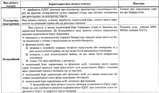 Розрізняють п'ять видів дієвого статусу, до яких може бути віднесений податковий борг: