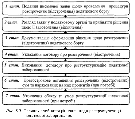 Діючим законодавством [85] передбачено зазначений нижче порядок прийняття рішення щодо реструктуризації податкової заборгованості (рис. 8.9).