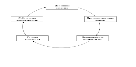 Авансирование означает, что затраченные в начале процесса производства денежные ресурсы возвращаются предприятию после завершения кругооборота. Именно из выручки от реализации продукции происходит возмещение авансированных денежных сумм и все возвращается к исходной позиции. Кругооборот оборотных активов представлен на рисунке 1 [25, стр. 214].
